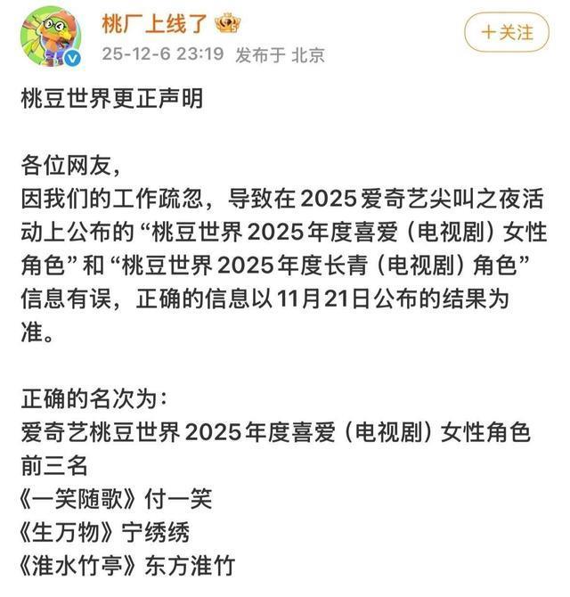 爱奇艺表示因为工作的疏忽,导致在尖叫之夜中公布的年度喜爱角色和长青角色信息有误,正确的结果以11月份的信息为准。