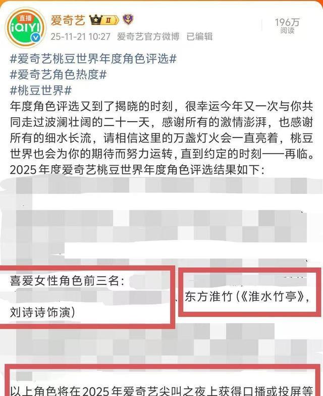 在颁发年度喜爱女性角色的奖项时,却闹了大乌龙,在11月份的公示名单当中,刘诗诗出演《淮水竹亭》中的东方淮竹是凭借着2.41亿热度稳居第三的位置。
